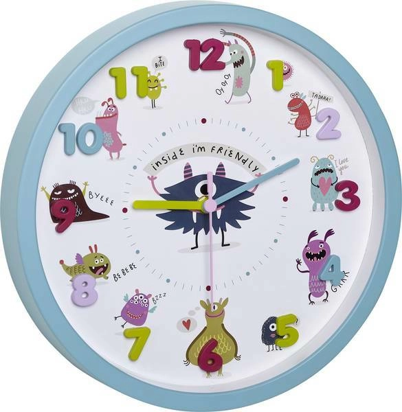 Veselé dětské nástěnné hodiny TFA Little Monsters s tyrkysovým ciferníkem a plastickými 3D číslicemi usnadňují dětem učení času. Každou hodinu doprovází vlastní příšerka, která hravou formou podporuje plánování dne. Hodiny mají tichý chod, jasné barvy a značení minut pro snadné čtení v dětském pokoji i školce.