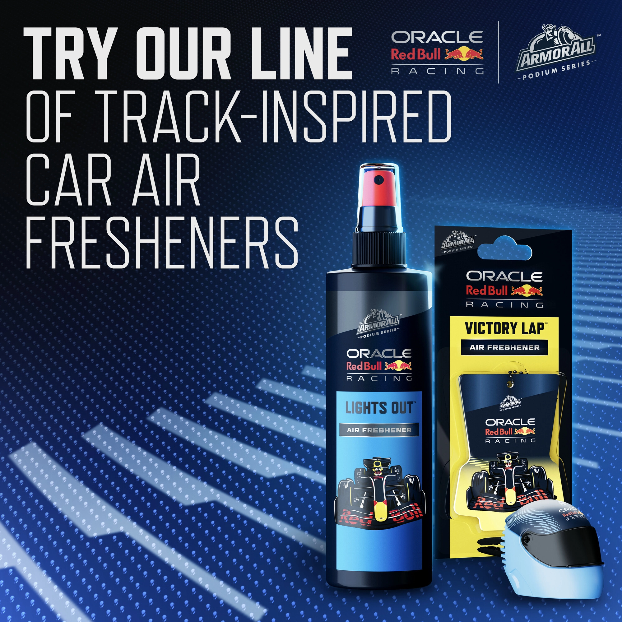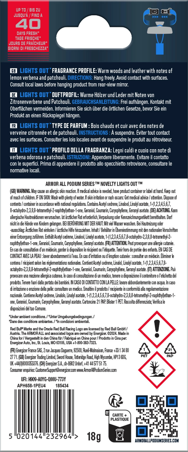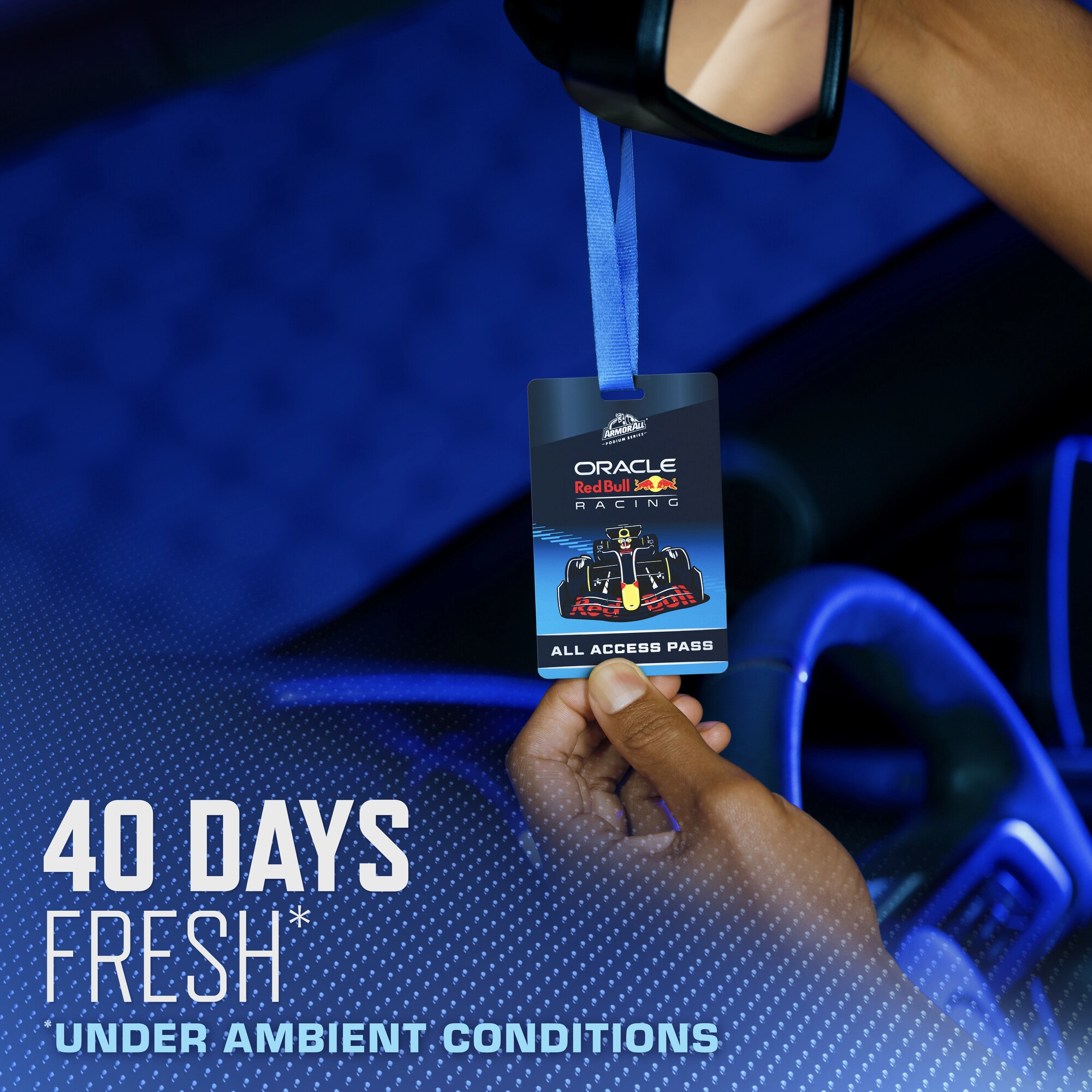 Vytvořte si příjemnou atmosféru v interiéru vozu s vůní, která odkazuje na svět rychlosti a preciznosti. Tato závěsná vůně Armor All Oracle Red Bull Lights Out – All Access Pass byla navržena ve spolupráci s Oracle Red Bull Racing a zaujme nejen vzhledem, ale i vyváženou kompozicí aromat.