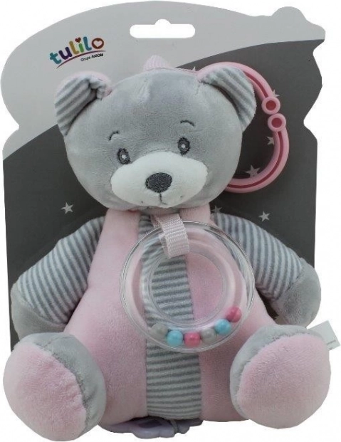 Chrastítko umístěné u krku medvídka vydává zvuky při pohybu, což stimuluje sluchové vnímání dítěte.