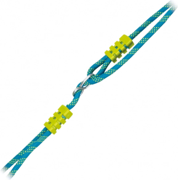 Modrá lana s žlutými prvky mají kovové průvlaky a kroužky pro rychlé zavěšení a plynulé nastavení délky až do 200 cm.