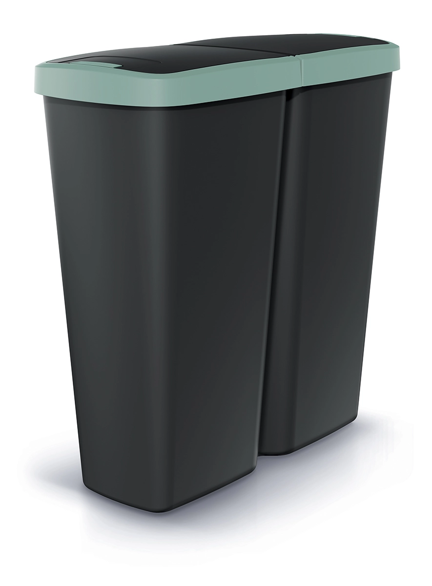 Prosperplast Compacta Q Duo přináší chytré řešení pro každodenní třídění. Jedna vnitřní nádoba se dvojitým víkem umožňuje oddělit např. smíšený odpad, plast nebo papír pomocí jednoho či dvou pytlů. Moderní kombinace černého těla a světle zeleného víka zapadne do každého interiéru.