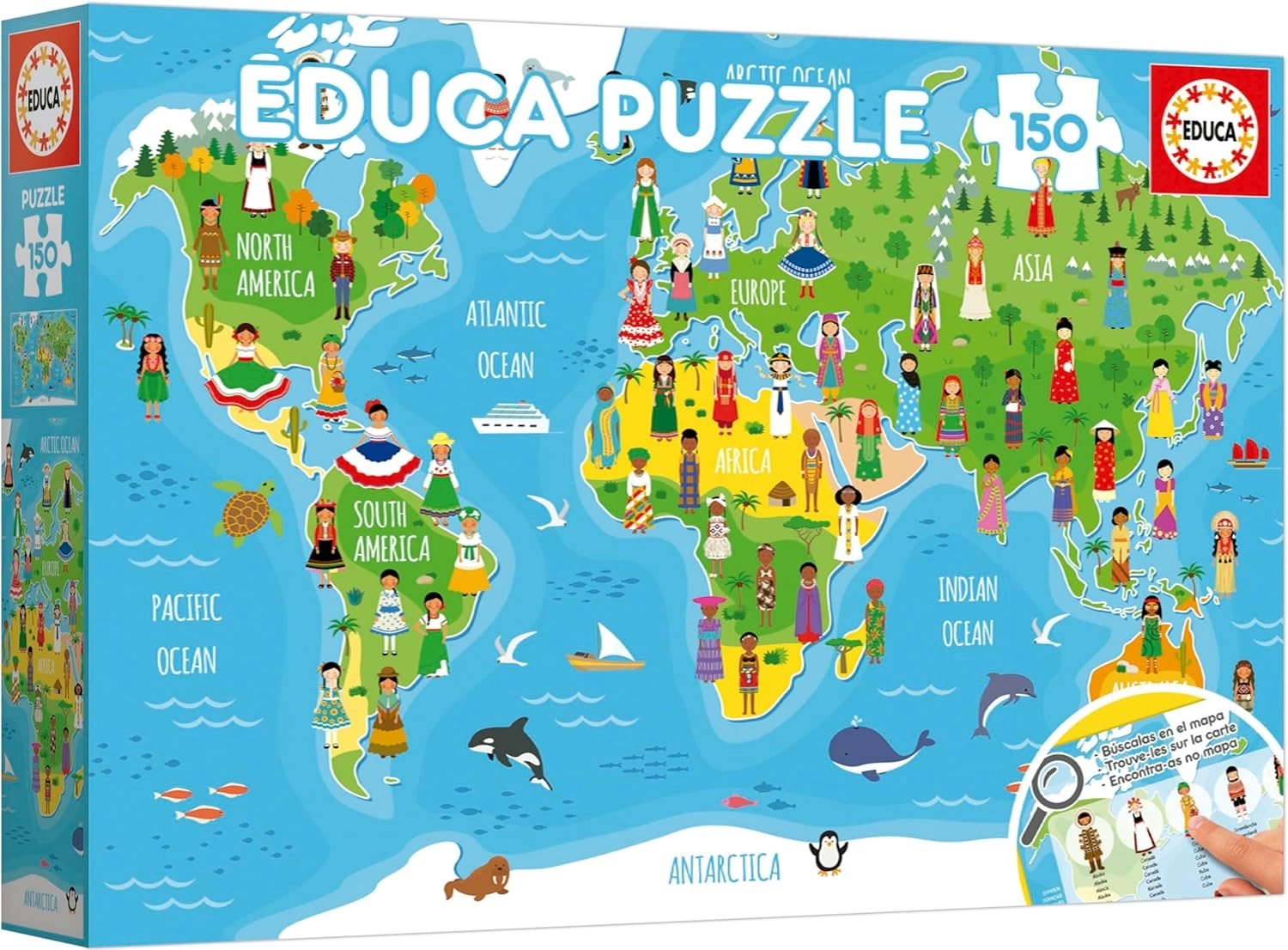 Vzdělávací puzzle přináší dětem zábavný způsob, jak poznat kontinenty, státy a kultury. Po složení vznikne přehledná mapa o rozměrech přibližně 48 × 34 cm, na níž mohou malí badatelé vyhledávat postavičky dívek a přiřazovat je k jednotlivým zemím.