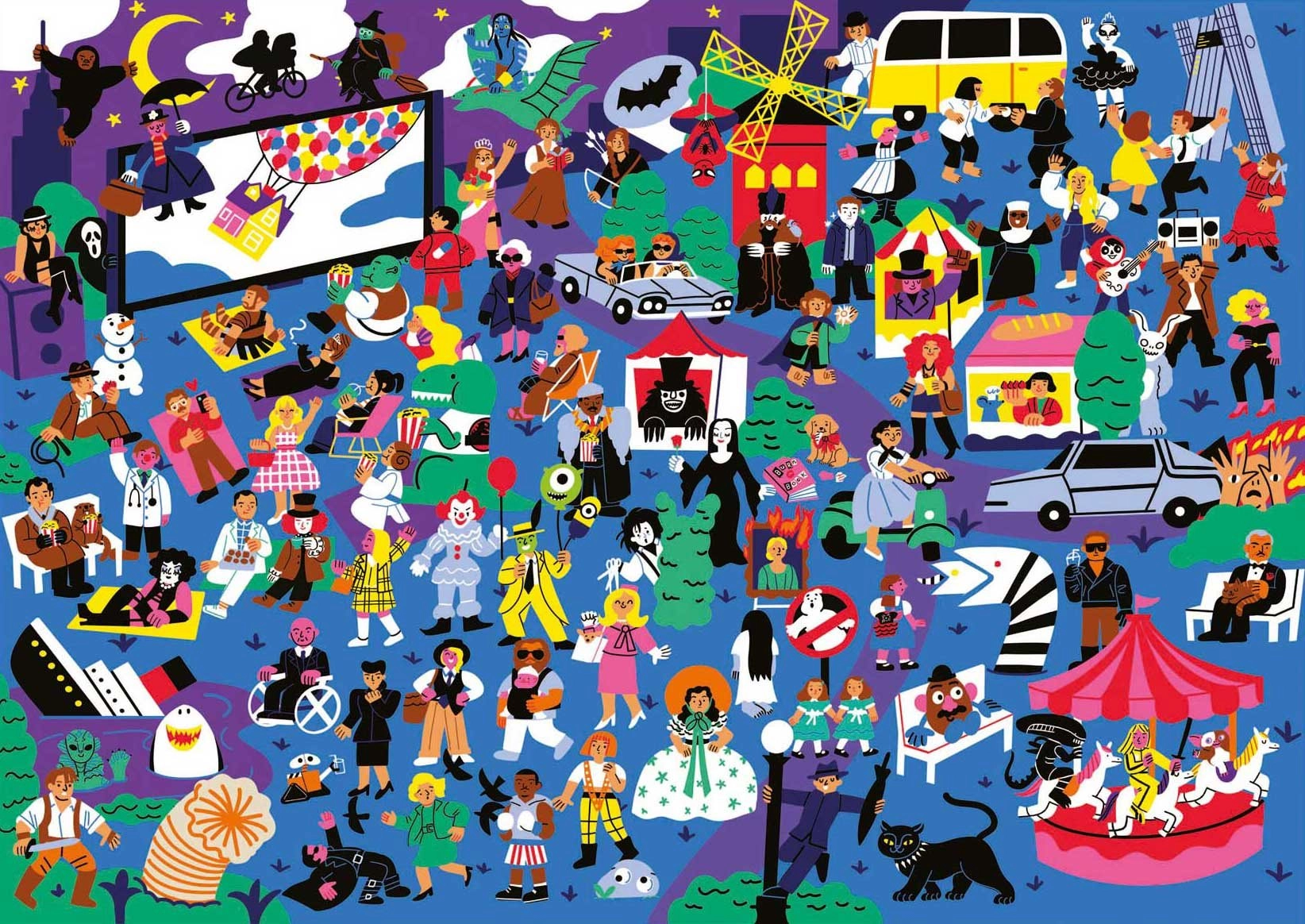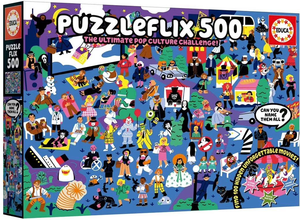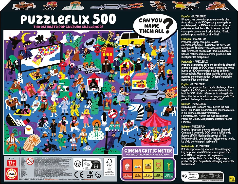 Objevte svět kinematografie při skládání originálního puzzle EDUCA Puzzleflix. Na obrazku je ukryto 100 odkazů na nezapomenutelné filmy, které potěší jak zkušené filmové fanoušky, tak milovníky hádanek. Přiložený plakát vám poslouží jako nápověda a průvodce, abyste žádný detail nepřehlédli.