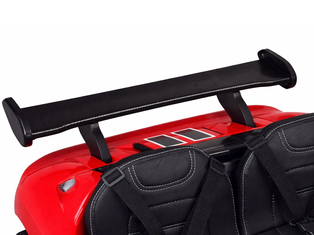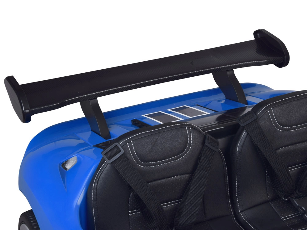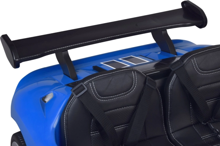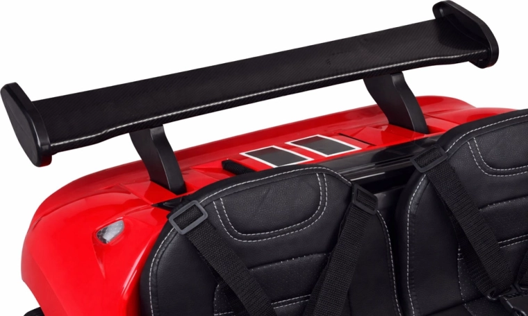Jízdu zpříjemní multimediální panel s Bluetooth, FM rádiem a USB/MP3 vstupy, zatímco bezpečnost zvyšují 3bodové pásy pro oba pasažéry, plynulý rozjezd a automatická brzda po uvolnění pedálu. Rodiče mají navíc plnou kontrolu díky dálkovému ovladači s volbou rychlosti a nouzovým tlačítkem STOP.