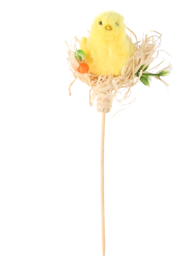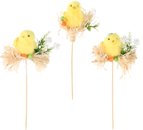 Roztomilé kuřátko na slámě na dlouhé tyčce dodá vašim květinám, vazbám i velikonočním věncům okamžitě svěží jarní nádech. Lehká konstrukce a snadné zapíchnutí umožní rychlou a čistou instalaci bez lepidla a drátků.