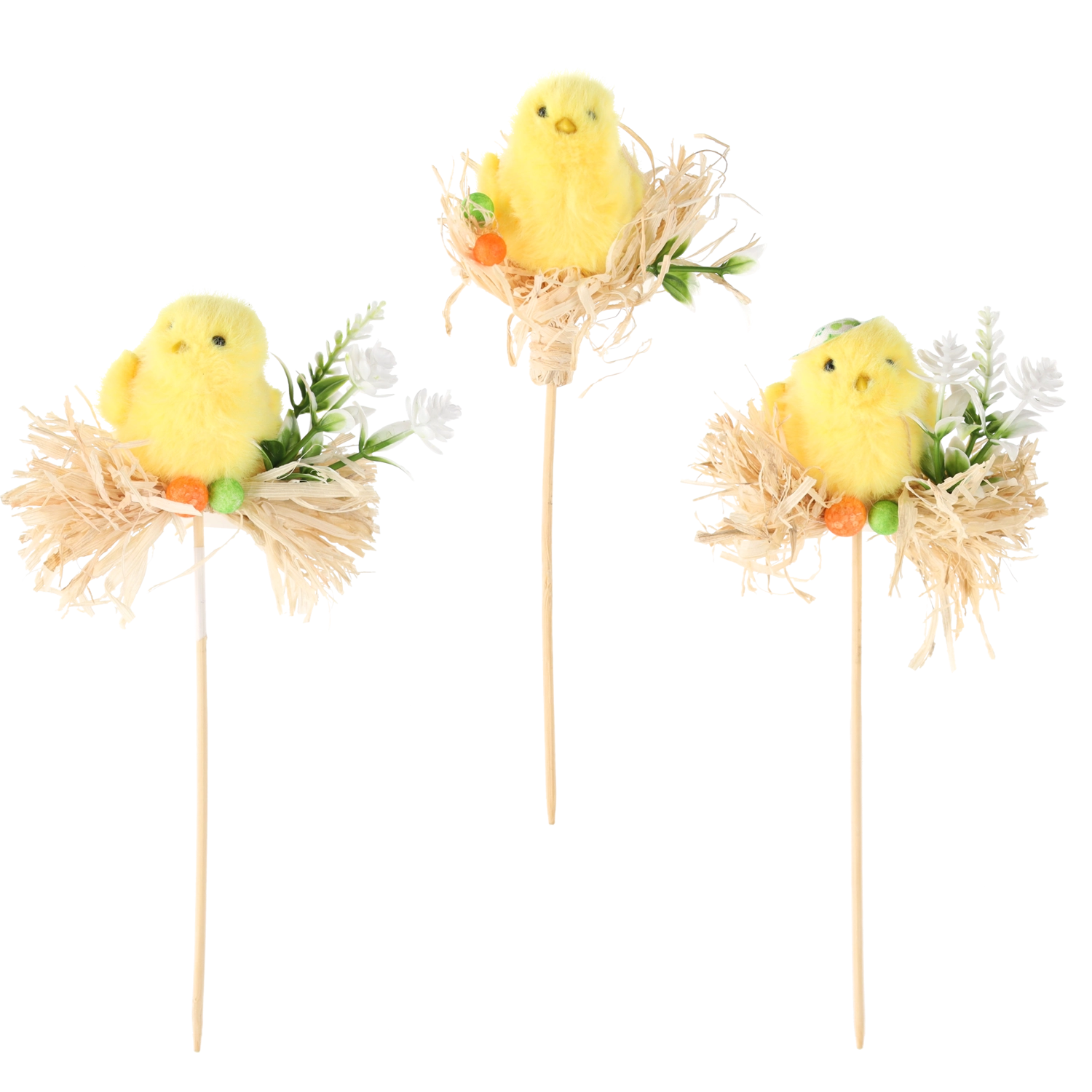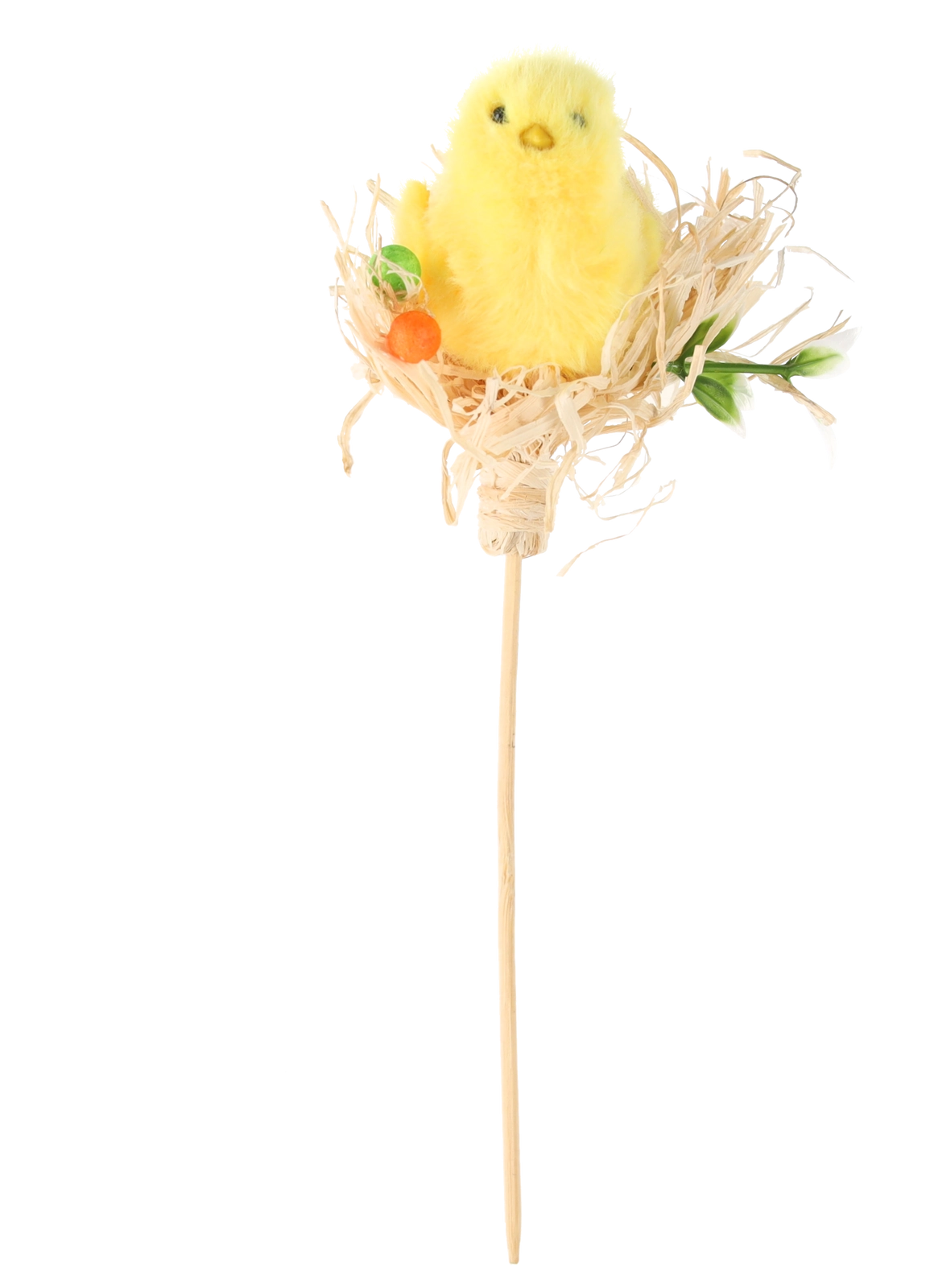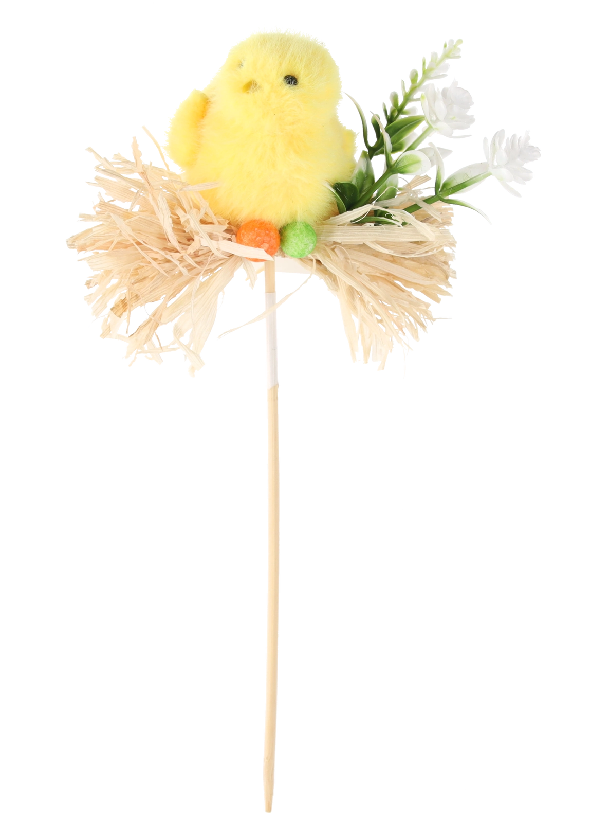 Měkké plyšové kuřátko, slámové hnízdo a dřevěný vzhled tyčky tvoří lehký, ale stabilní doplněk pro jarní aranžmá.