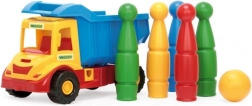 Vyklápěcí vůz Multi Truck s pohyblivou nákladní korbou nabízí zábavu pro naše malé ratolesti. Součástí je sada na kuželky s 5 barevnými kuželkami a koulí.