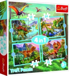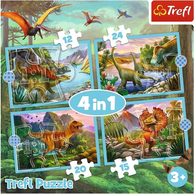 Trefl puzzle 4 v 1 Výjimeční dinosauři je balení, které potěší každého malého archeologa! Obsahuje čtyři různé skládačky s motivy dinosaurů, každou s odlišným počtem dílků (12, 15, 20, 24). Po složení puzzlí vzniknou čtyři obrázky o rozměrech 285 x 205 mm, což zaručí zábavu jak pro mladší, tak i starší fanoušky puzzle her.