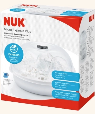 NUK Micro Express Plus je parní sterilizátor do mikrovlnné trouby, který se postará o spolehlivou dezinfekci kojeneckých lahví a příslušenství během pár minut. Díky chytrému držáku pojme až 4 lahve o objemu 300 ml se širokým hrdlem a udrží je ve správné poloze pro efektivní sušení. Průhledné víko a nový blokovací systém zajišťují bezpečné a přehledné používání.