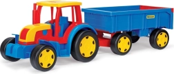 Náš velký traktor z řady Gigant je vybaven přívěsem s otvíratelnou zadní klapkou. Tyto vozidla jsou ideální hračkou pro děti, ať už jde o stavbu, nakládání nebo přesun materiálů. Pohyblivá lžíce traktoru slouží jako buldozer nebo nakladač, což přidává na zábavnosti hry. Předností tohoto traktoru je kvalitní zpracování, odolnost a nosnost konstrukce - traktor unese až 100 kg a přívěs 60 kg.