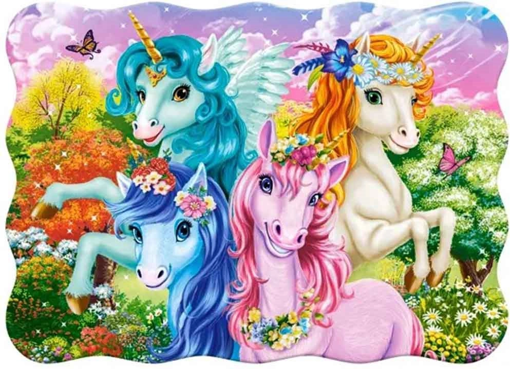 Objevte svět fantazie s puzzle Castorland Jednorožci. Velké dílky o přibližně 5 cm usnadňují uchopení i skládání dětským ručičkám a tvarovaný okraj pomáhá s orientací v obrázku. Hotové puzzle má rozměr cca 32 × 23 cm – ideální velikost pro první skládačky.