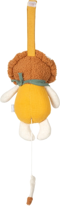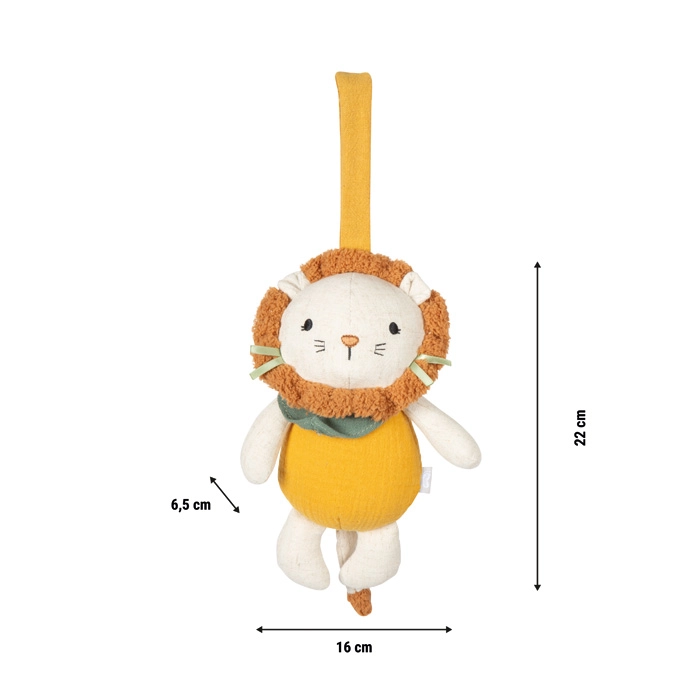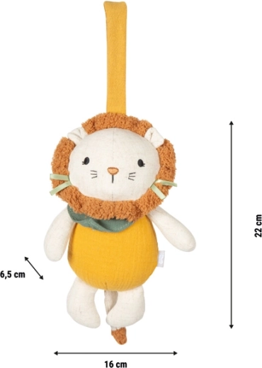 Látkový lvíček kombinuje jemné materiály, zábavný design a praktické využití pro každodenní rutinu miminka. Po zatažení za šňůrku se rozezní příjemná ukolébavka, která pomáhá k rychlejšímu usínání a klidnému odpočinku. Díky kompaktním rozměrům se vejde do kočárku i k postýlce a je vždy po ruce.