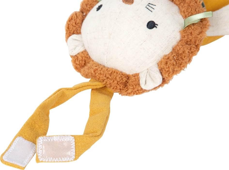 Díky praktickému poutku hračku rychle připevníte na postýlku, kočárek nebo přebalovací pult – lvíček je vždy po ruce.