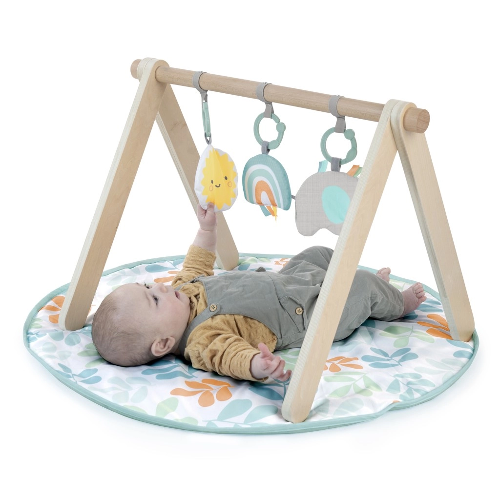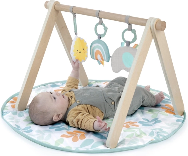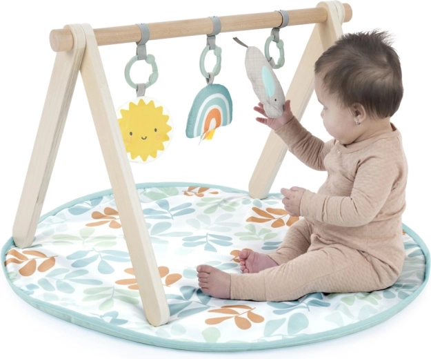 Vytvořte svému miminku klidnou zónu pro hraní a odpočinek. Dřevěná hrazdička s A-rámem zajišťuje stabilitu, zatímco kulatá, měkce polstrovaná podložka s listovým vzorem poskytuje komfort pro hraní na zádech i pro tummy time. Odnímatelné hračky na kroužcích snadno přemístíte, aby bylo hraní vždy podnětné.