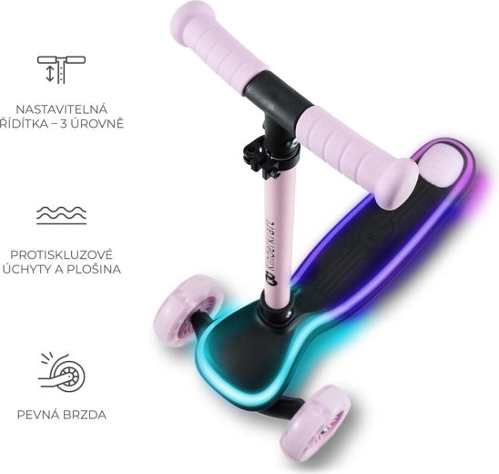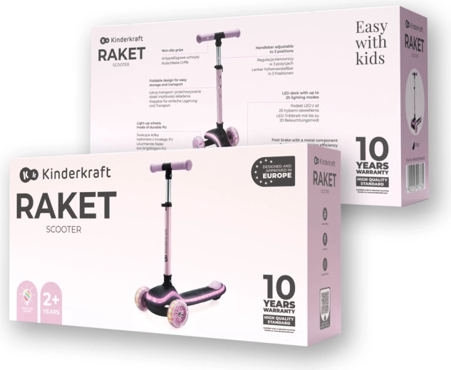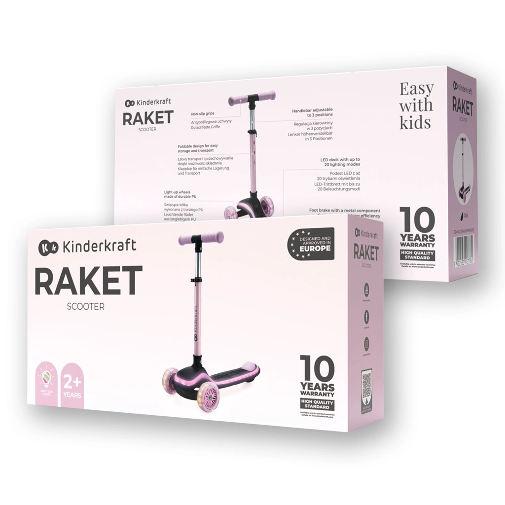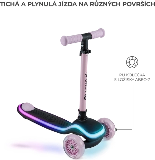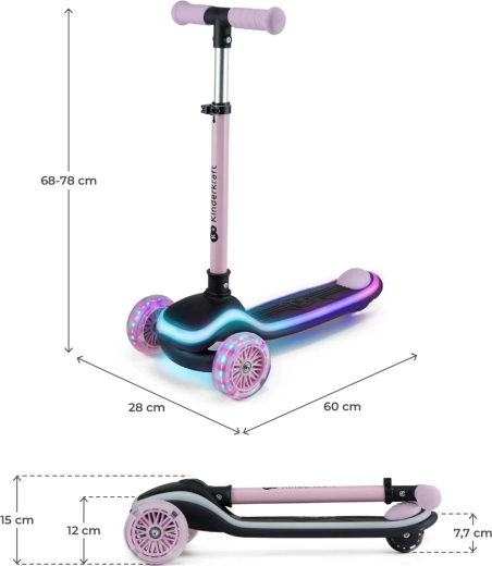 Objevte radost z jízdy s dětskou tříkolovou koloběžkou KINDERKRAFT Raket Pink. Intuitivní řízení náklonem rozvíjí rovnováhu a koordinaci, LED podsvícená plošina a RGB svítící kolečka zvyšují viditelnost i zábavu. Díky nastavitelným řídítkům, rychlému skládání a tichým PU kolečkům s ložisky ABEC-7 je ideální volbou pro první jezdecké zážitky.