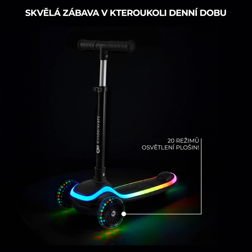 Až 20 světelných režimů na plošině a svítící kolečka zajišťují, že dítě bude lépe vidět i po setmění – a jízda bude ještě zábavnější.