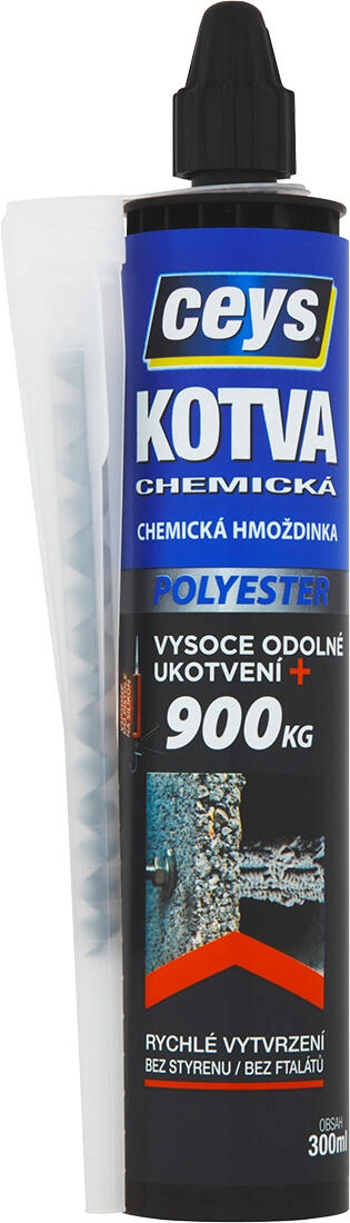 CEYS Chemická kotva polyesterová 300 ml je rychle tuhnoucí dvousložkový tmel pro extrémně pevné a bezpečné kotvení do dutých i plných materiálů. Díky absenci rozpínání je vhodná pro montáže, kde hrozí prasknutí podkladu, a umožňuje kotvení i v blízkosti okrajů.