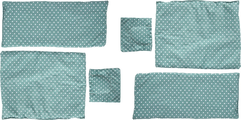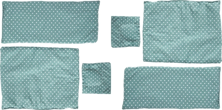 Součástí balení jsou měkké polštáře, přikrývky a prostěradla v ladícím puntíkovaném designu.