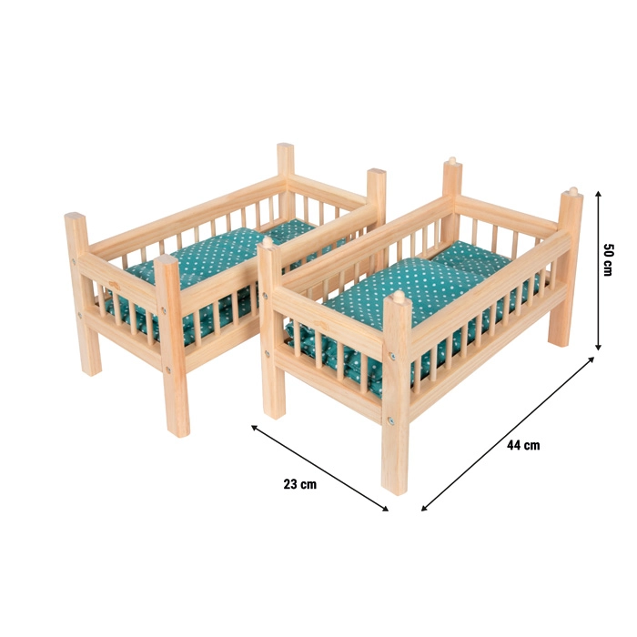 Dopřejte panenkám i plyšákům pohodlný spánek ve stylové postýlce 2 v 1. Tato robustní postel z přírodního dřeva se dá snadno použít jako patrová postel nebo rozdělit na dvě samostatná lůžka. Má zaoblené hrany pro bezpečné hraní, je vhodná pro hračky do 39 cm a součástí je i kompletní ložní prádlo v roztomilém puntíkovaném designu.
