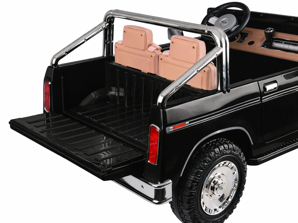 Stylové elektrické autíčko pickup ve stylu klasického FORD BRONCO přináší retro design, místo pro dvě děti a bezpečnou jízdu s pásy, plynulým rozjezdem a automatickou brzdou. Nabízí otvírací dveře, elegantní sedadla, světla a bohatou multimediální výbavu včetně Bluetooth, FM rádia a USB/MP3. Součástí je také dálkové ovládání pro rodiče.
