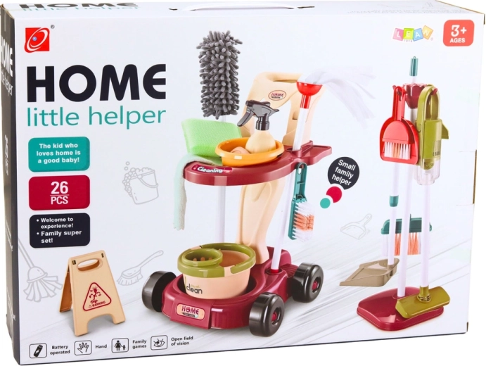 - 26 prvků pro pestrou hru: vozík, vědro s mopem, vysavač, kartáče, smetáčky, šňůrky, hadříky a další.