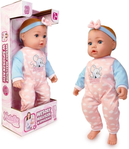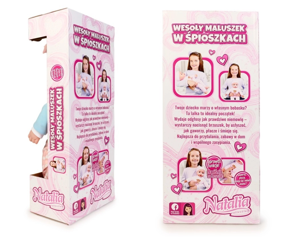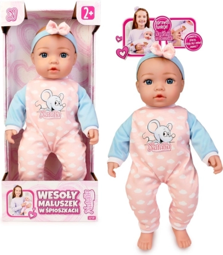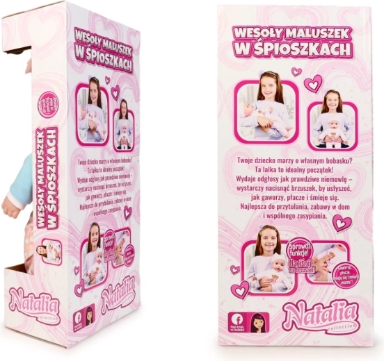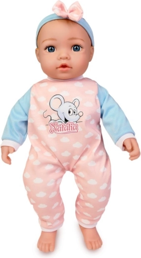 Roztomilé miminko od značky Natalia potěší každé dítě. Panenka s měkkým tělíčkem o velikosti 45 cm po stisknutí bříška vydává realistické zvuky – směje se, pláče, žvatlá a říká „máma“ a „táta“. Skvělá volba pro rozvoj empatie a hraní na pečování.