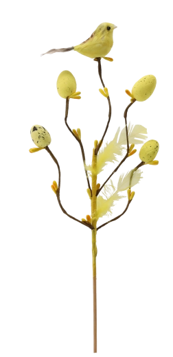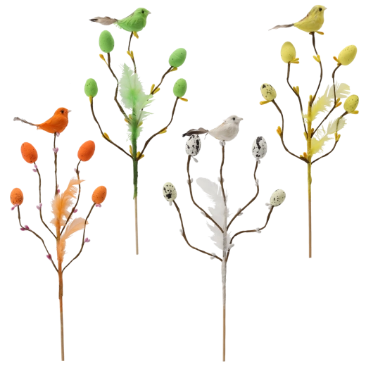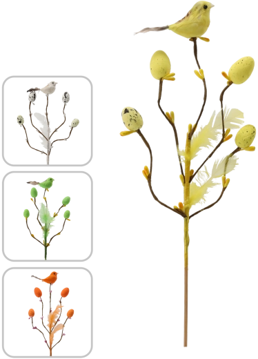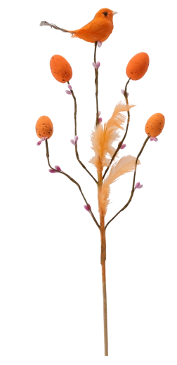 Tato stylová velikonoční dekorace na piku přináší do interiéru svěžest a radost jara. Větvička s drobnými odnožemi je doplněná o ptáčka, jemná pírka a vajíčka s tečkovaným dekorem, které působí přirozeně a hravě. Díky subtilnímu stonku ji snadno zapíchnete do květinových aranžmá, mechových dekorů nebo vložíte do úzké vázy.