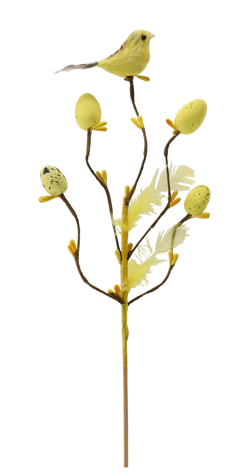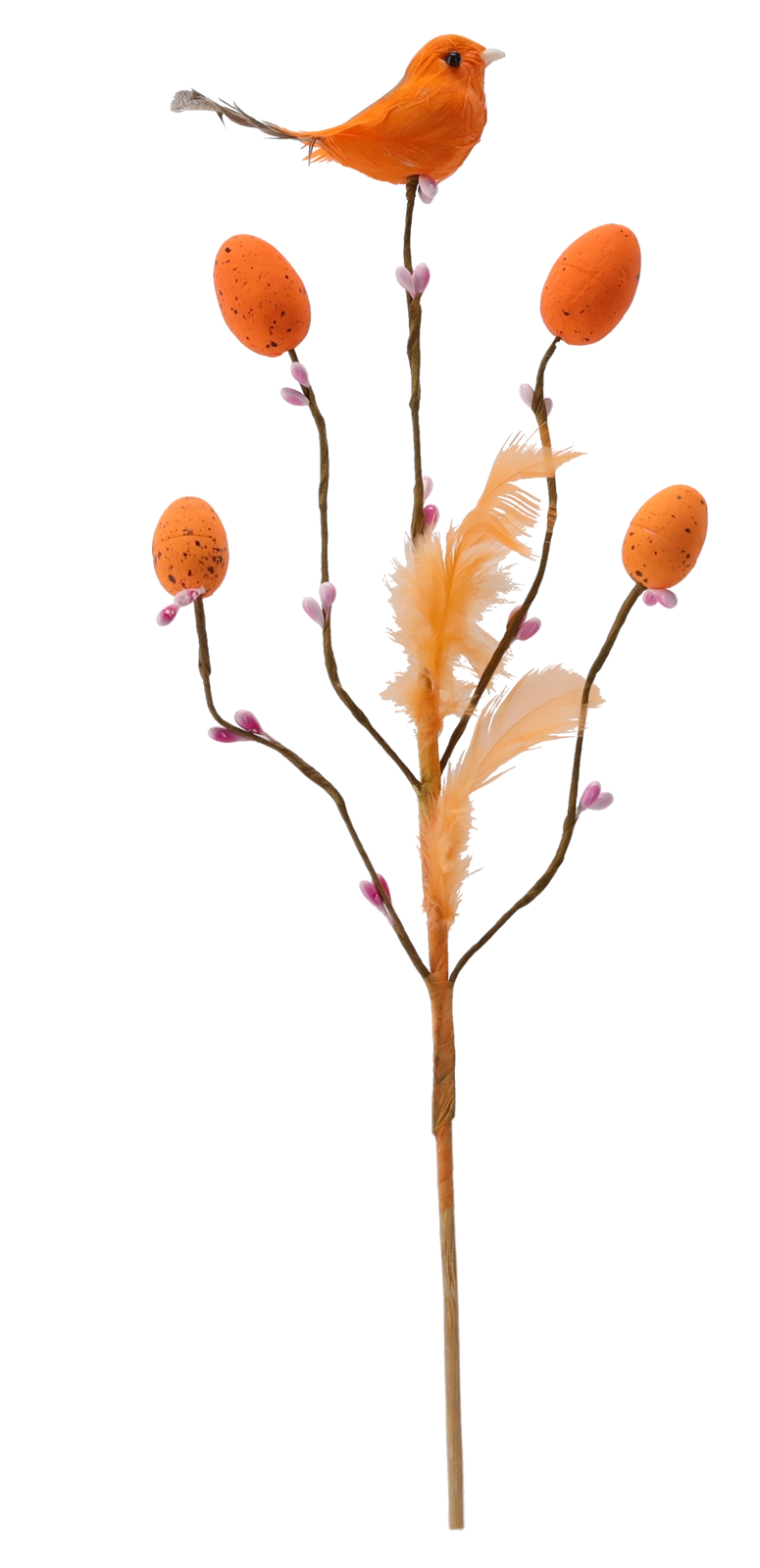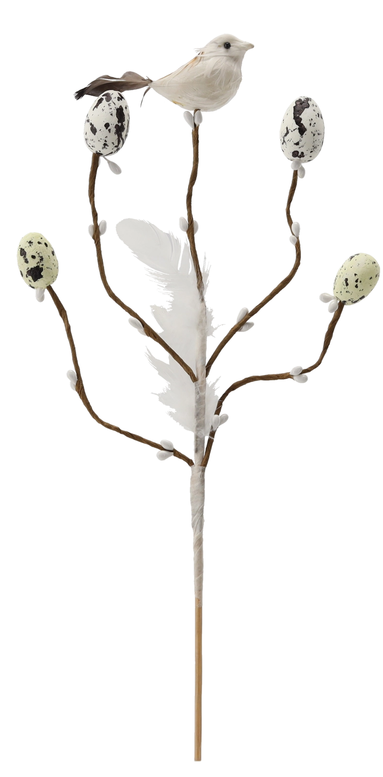 Dekor doplňují spečkovaná vajíčka, jemná pírka a malý ptáček, které působí přirozeně a dodají aranžmá živost.