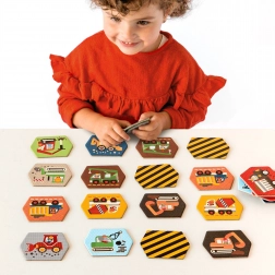 Různé vozidlové ilustrace na hexagonálních kartách pomáhají dětem nejen zlepšovat paměť, ale také podporují poznávací schopnosti při zachování hravosti.