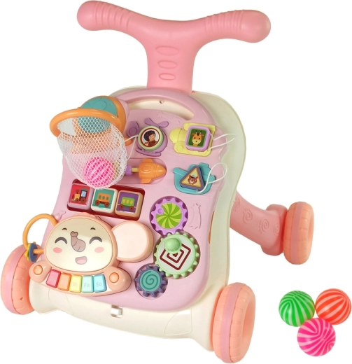 Růžové interaktivní chodítko a hrací stolek 2v1 podporuje první krůčky a zároveň rozvíjí smysly a jemnou motoriku. Nabízí odnímatelný vzdělávací panel s klavírem, ozubenými kolečky, tvary, košíkem na míčky a točícími kostkami. Díky možnosti zablokovat zadní kolečka a zatížit nádržku vodou je hra bezpečná a stabilní. Panel lze odepnout a používat samostatně doma i na cestách.
