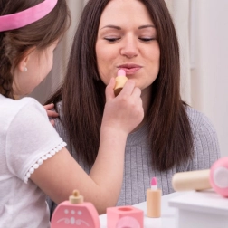 Roztomilá 11dílná dřevěná sada pro hru na salon krásy v praktickém přenosném kufříku potěší všechny malé parádnice od 3 let. Děti si užijí napodobování dospělých s doplňky jako zrcátko, hřeben, fén, rtěnka či lak na nehty – a zároveň rozvíjejí kreativitu a jemnou motoriku i sociální a jazykové dovednosti. Vyrobeno z kvalitních a bezpečných materiálů, odpovídá evropským normám.