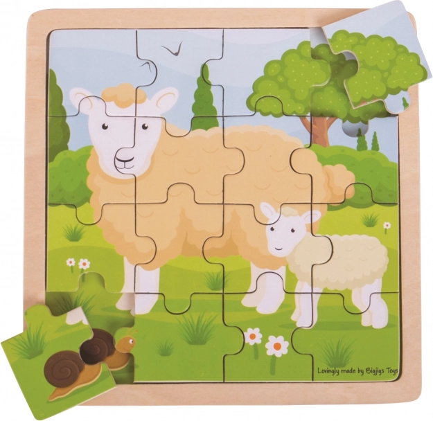 Toto dřevěné rámové puzzle BIGJIGS TOYS přináší něžný motiv ovečky s jehňátkem, který děti nadchne na první pohled. Dílky se skládají přímo do rámu na podklad se stejným motivem, takže se obrázek neposouvá a děti snadno vidí, kam který dílek patří.