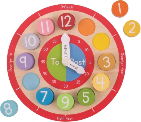 Tato kvalitní dřevěná výuková pomůcka přináší dětem od 18 měsíců zábavný způsob, jak se učit čísla, barvy, tvary a základy měření času. Barevně sladěné dílky s čísly 1–12 se vkládají do odpovídajících slotů, čímž podporují rozpoznávání tvarů a barev i koordinaci oko–ruka. Jasné anglické popisky na ciferníku pomáhají přirozeně osvojit slovní spojení používaná při určování času.