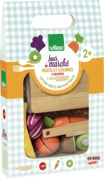 Dřevěný košíček s ovocem a zeleninou je ideální pro dětské kuchyňky. Obsahuje pět druhů ovoce a zeleniny, krájecí desku a nůž, vše vyrobeno z kvalitního dřeva.