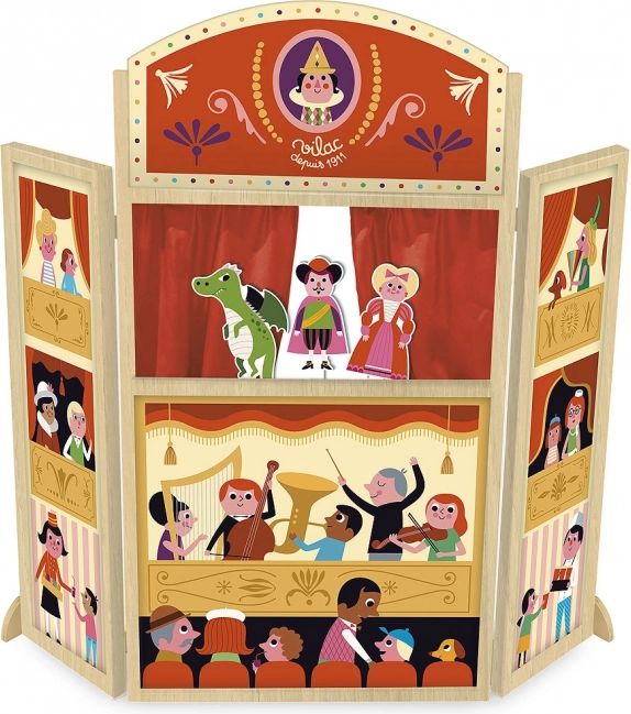 Objevte kouzlo domácího loutkového představení. Trojstěnné dřevěné divadlo Vilac Mon Joli s oknem a oponou vytváří dokonalou scénu pro pohádkové příběhy. Veselé ilustrace od švédské umělkyně Ingely P. Arrhenius dodávají jevišti výrazný retro nádech a motivují děti k tvořivé hře.