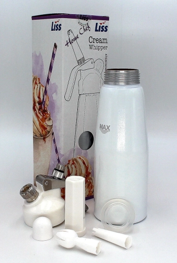 Objevte pohodlí domácí přípravy šlehačky se šlehačkovou lahví LISS Home Chef o objemu 0,5 l. Hliníkové tělo s bílým lakem a vnitřní povrchovou úpravou zajišťuje dlouhou životnost a snadnou údržbu. Doporučené množství smetany 250–400 ml přináší optimální nadýchanost, maximální objem směsi je 500 ml.
