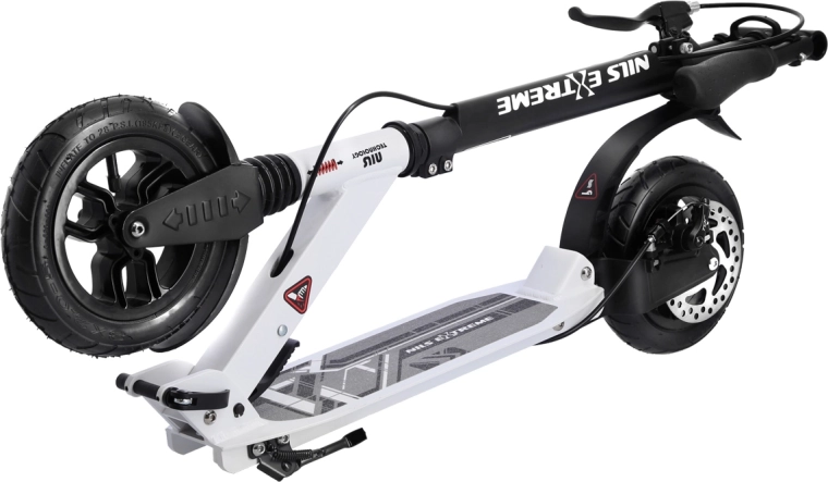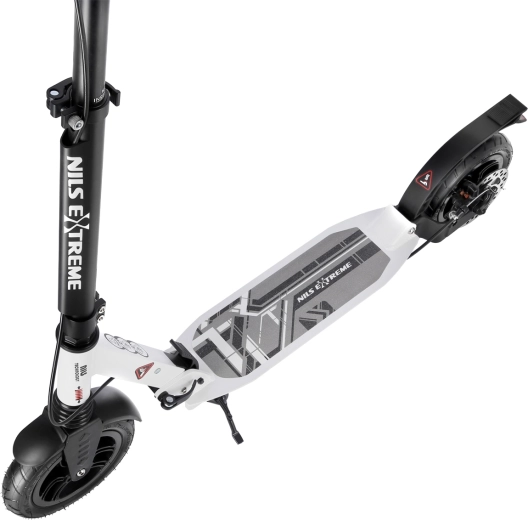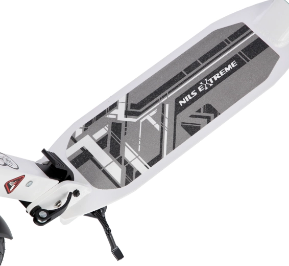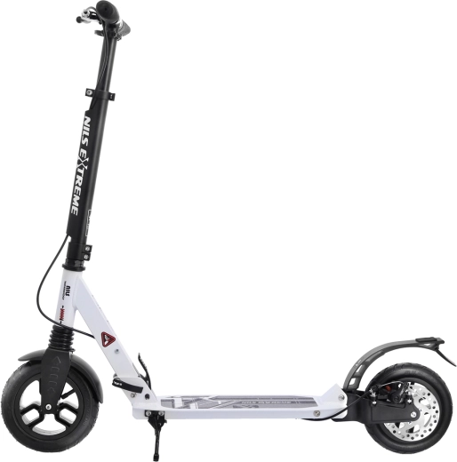 Bezpečnost zvyšuje zadní kotoučová brzda ovládaná páčkou na řídítkách a doplněná přítlačným blatníkem. Pumpovaná 200mm kola s ložisky ABEC 9 zajišťují rychlý rozjezd, stabilitu a plynulost. Gumové rukojeti, praktický skládací stojánek a blatník na předním kole dotvářejí komfortní výbavu.