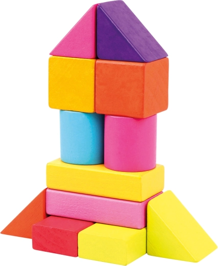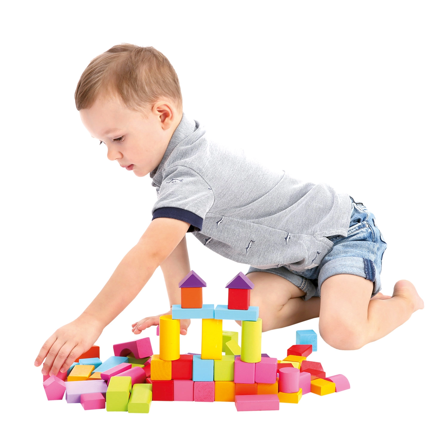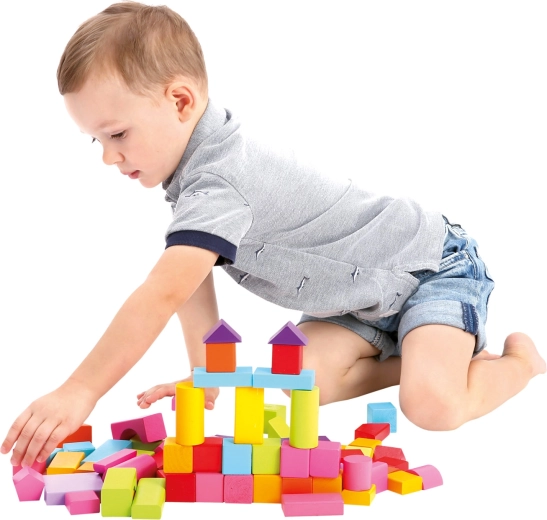 Ideální pro děti od 1 roku: kostky mají příjemně hladký povrch, pestré nezávadné barvy a tvarově pestrou škálu – od kostek a kvádrů přes válce až po oblouky a trojúhelníky. Hra s kostkami podporuje rozvoj prostorového vnímání, tvořivosti i koordinace oko–ruka.