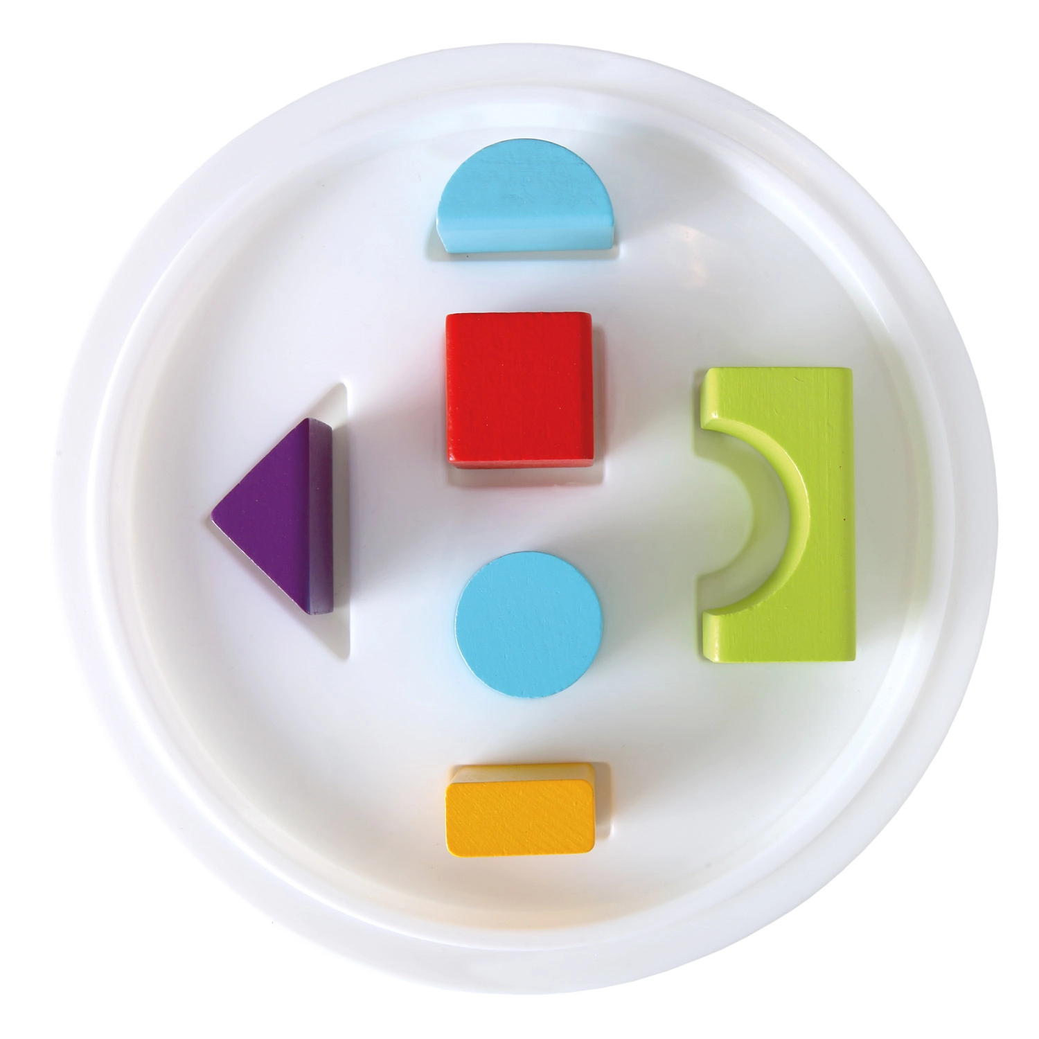 Balení promění víko kyblíku ve vkládačku. Děti tak nenápadně trénují rozpoznávání tvarů, koordinaci a logické myšlení při uklízení kostek.