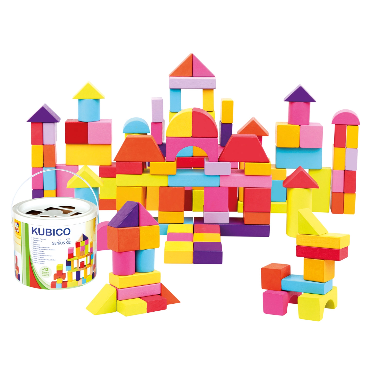 Tato bohatá sada dřevěných kostek v nových barvách přináší dětem nekonečné možnosti stavění věží, mostů i jednoduchých staveb. Praktické balení v kartonovém kyblíku usnadňuje ukládání a přenášení, zatímco víko s otvory funguje jako vkládačka pro procvičení logiky a trpělivosti.