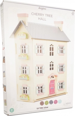 Domeček pro panenky Cherry Tree Hall od značky LE TOY VAN je nadčasový kousek do dětského pokoje. Čtyři patra s individuálně dekorovanými stěnami, dřevěnými schodišti a půdou přístupnou po žebříku zvou k nekonečným příběhům. Otevírací fasáda a pohyblivé okenice dodávají hře na realističnosti, zatímco růžové dveře a pastelové detaily vytvářejí útulnou atmosféru.