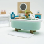 Stylová sada koupelnového nábytku pro domeček pro panenky v měřítku 1:12 od značky LE TOY VAN. Obsahuje vanu, toaletu, umyvadlo, věšák na ručníky a lékárničku, ručně domalovanou netoxickými barvami na bázi vody. Vyrobeno eticky z udržitelných materiálů, podporuje kreativní hru, komunikační dovednosti a koordinaci.