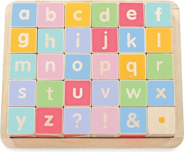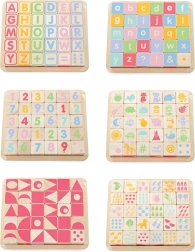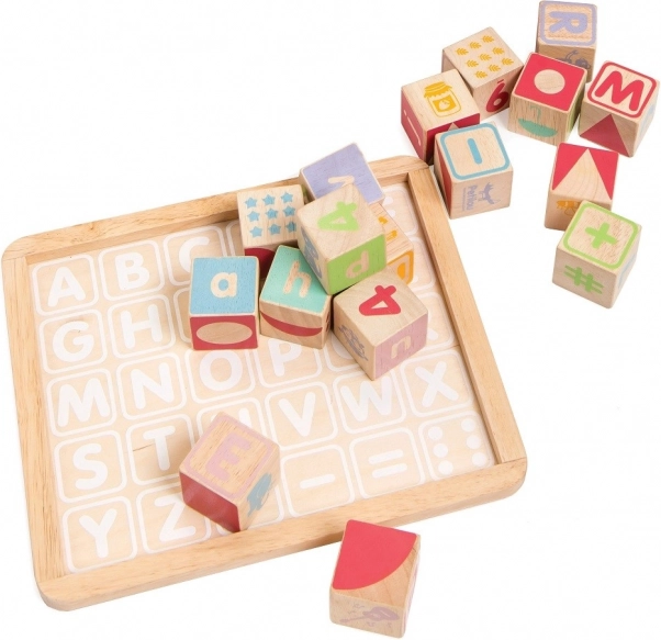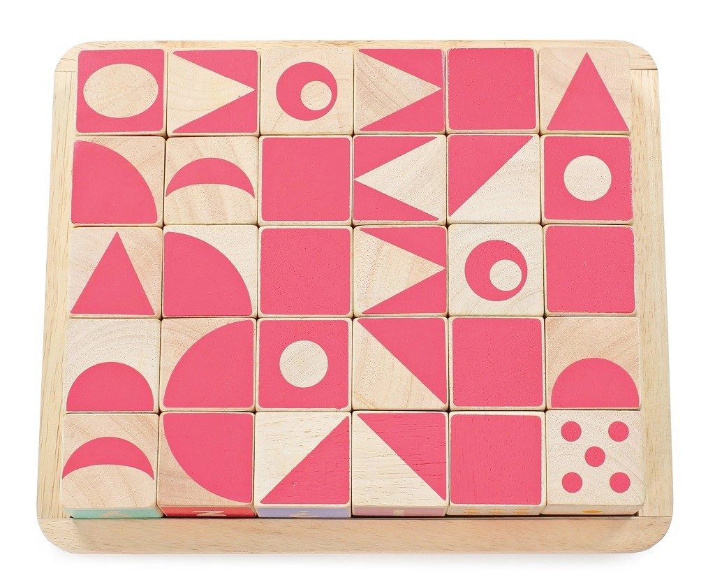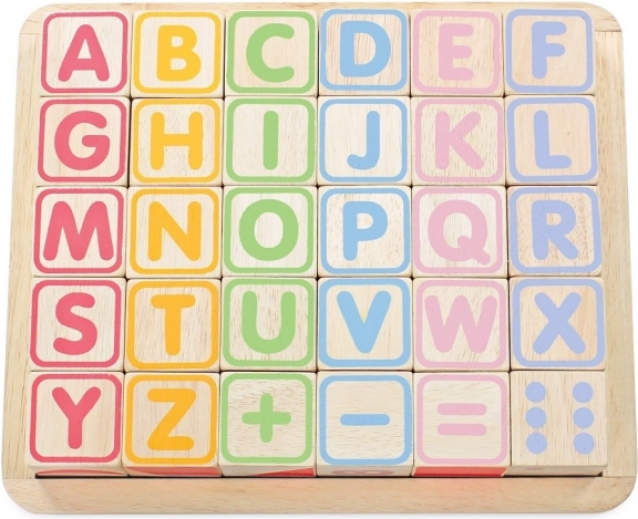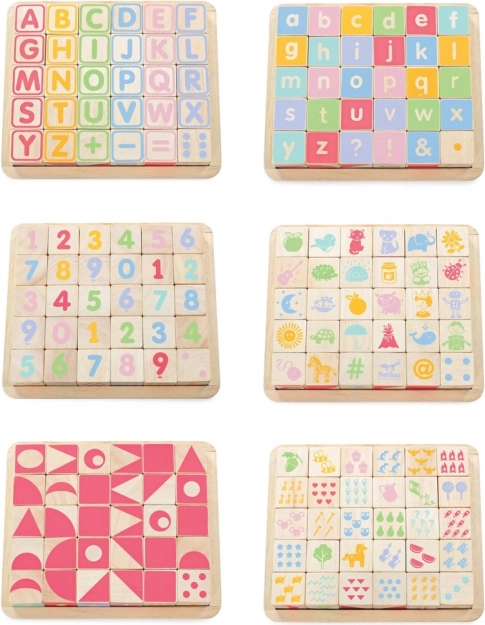 Zaoblené hrany kostek i úložné desky zajišťují komfortní a bezpečnou manipulaci. Hračka je bez obsahu plastu, vyrobená z FSC certifikovaného dřeva s důrazem na etickou výrobu a udržitelnost. Sada podporuje rozvoj kognitivních dovedností, prostorové představivosti a jazykových schopností.