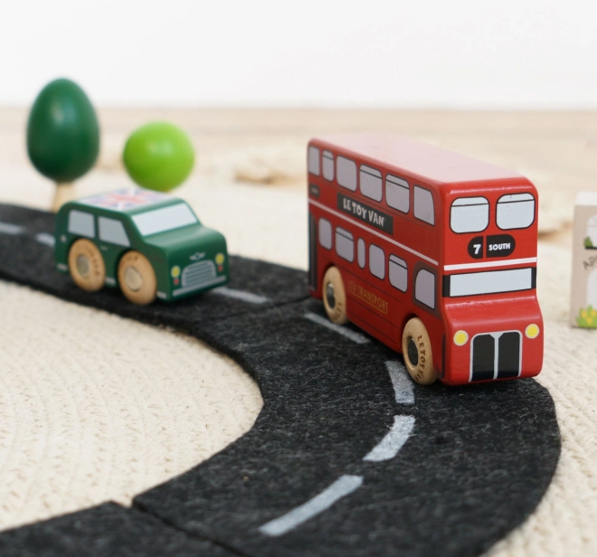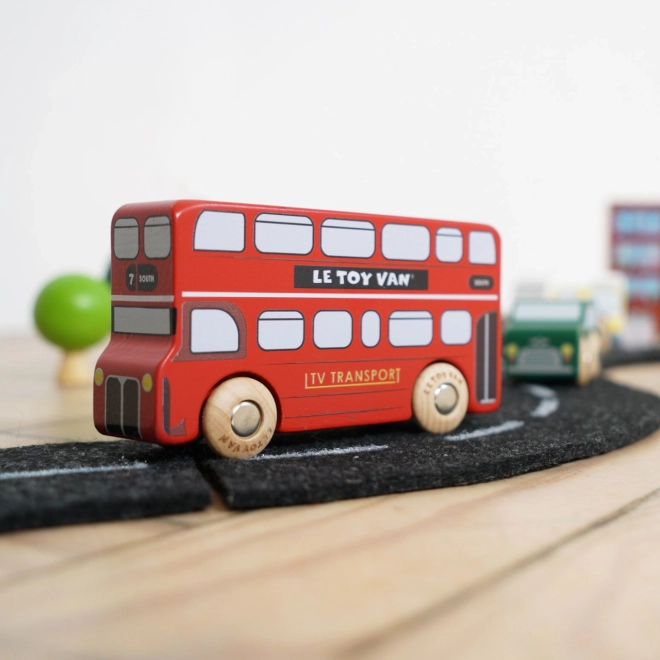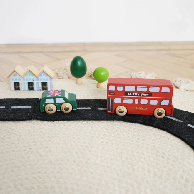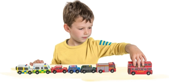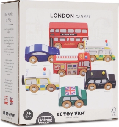 Objevte svět rušných londýnských ulic s detailně zpracovanými dřevěnými vozidly od Le Toy Van. Sada zahrnuje dvoupatrový autobus, černý taxík, hasičské auto, sanitku, policejní vůz a dvě osobní auta. Robustní provedení z udržitelného kaučukového dřeva a hladké hrany jsou ideální pro malé dětské ruce, které si při hře procvičí úchop, koordinaci ruka–oko i fantazii.