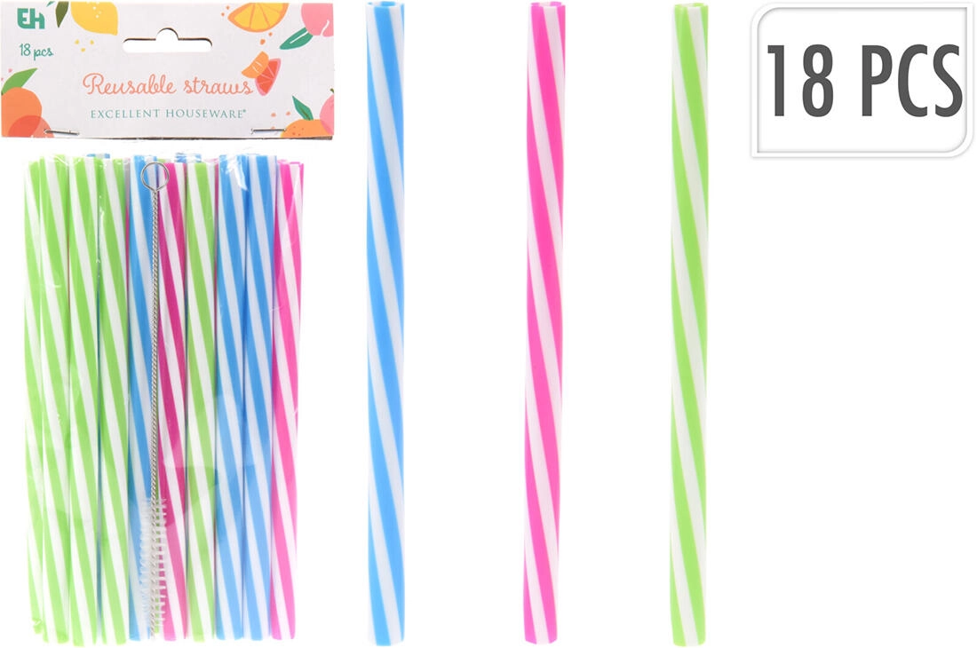 Praktická sada opakovaně použitelných brček v mixu barev pro každodenní pití doma i na cestách. Obsahuje 18 kusů brček a čisticí kartáček pro snadnou údržbu. Brčka o průměru 10 mm a délce 180 mm jsou ideální pro smoothie, šťávy i limonády. Díky odolnému provedení jsou vhodná pro dlouhodobé používání a pomáhají snižovat odpad z jednorázových brček. Opakované použití, široký průměr 10 mm, mix barev, snadné čištění.