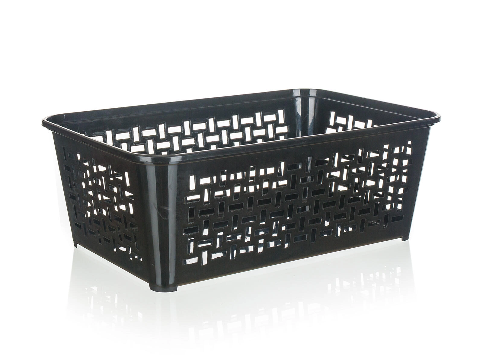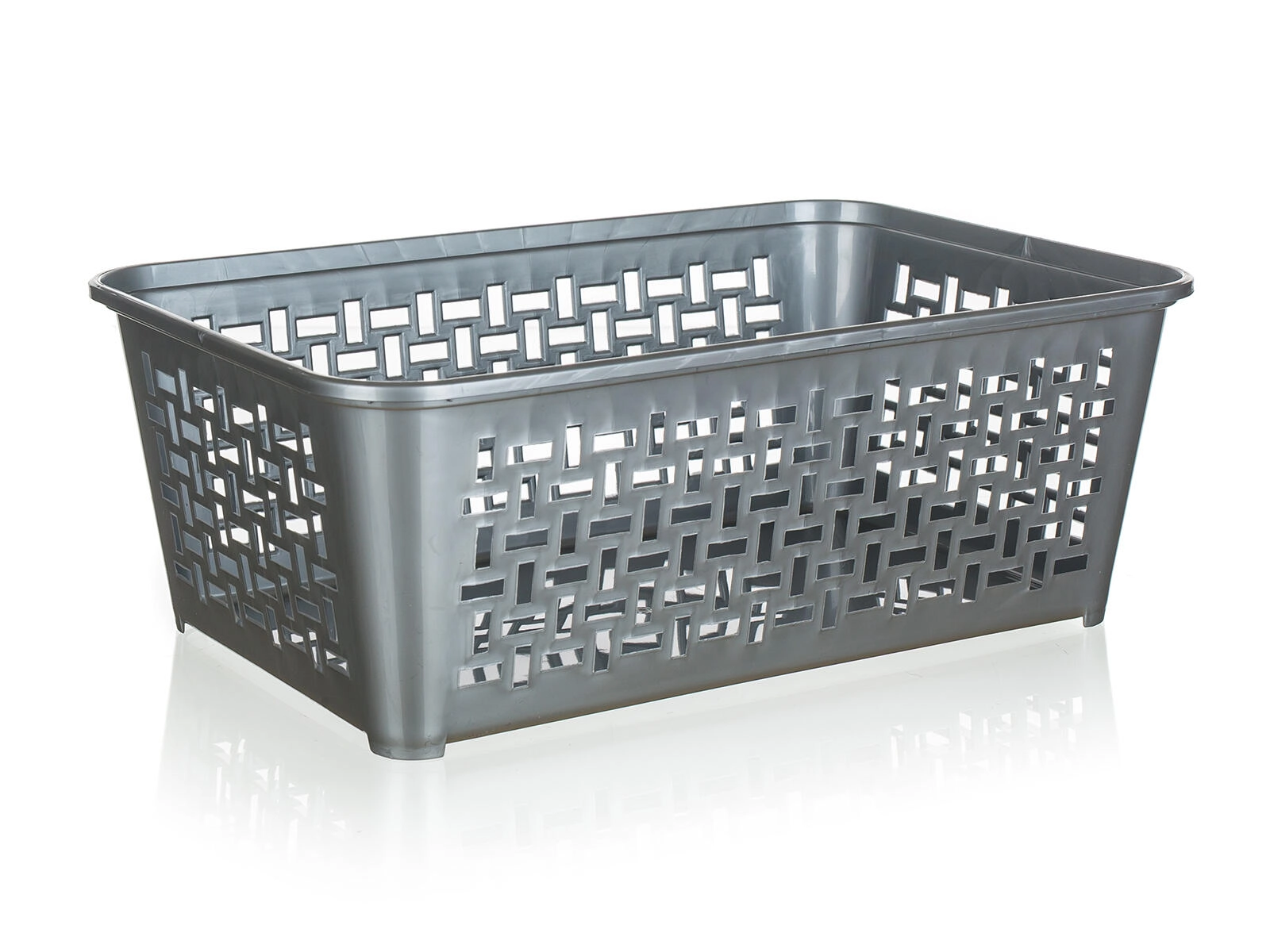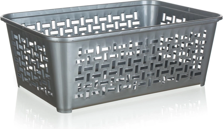 Praktický plastový košík o rozměrech 30 × 20 × 11 cm pro přehledné uložení domácích doplňků, potravin či kancelářských potřeb. Nabízí odvětrávané bočnice s designovým perforováním, pevný okraj pro dlouhou životnost a možnost vytvoření mezipatra vložením menšího košíku 19 × 9,7 cm. Dostupný v mixu barev (černá, bílá, krémová, červená, zelená, šedá).