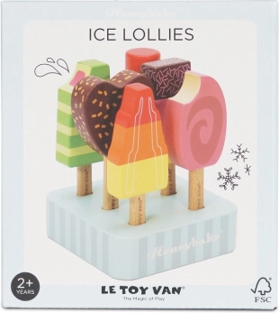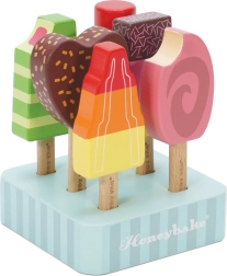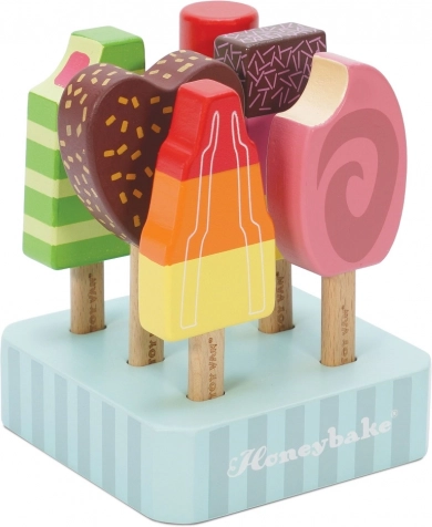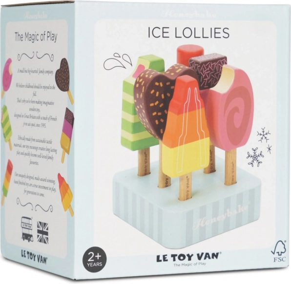 Barevná sada šesti dřevěných nanuků LE TOY VAN z kolekce Honeybake přináší fantastickou představivou hru a bezpečnou zábavu. Díky odolnému FSC dřevu, netoxickým barvám na vodní bázi a přiloženému stojánku je ideální pro dětské kuchyňky i zmrzlinové stánky. Podporuje jemnou motoriku, kreativitu a kognitivní dovednosti.