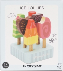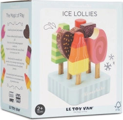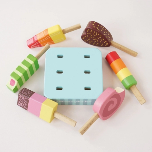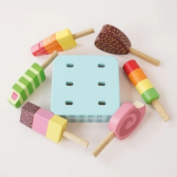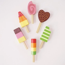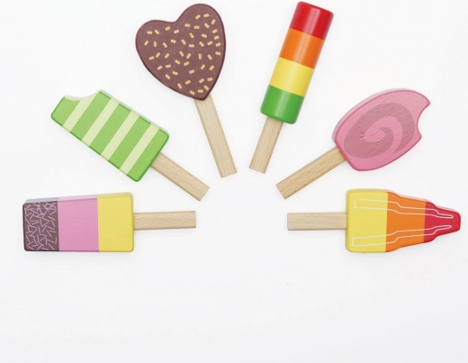 Šest unikátně malovaných dřevěných nanuků s veselými barvami a tvary rozvíjí fantazii a láká k nekonečné roli zmrzlináře.