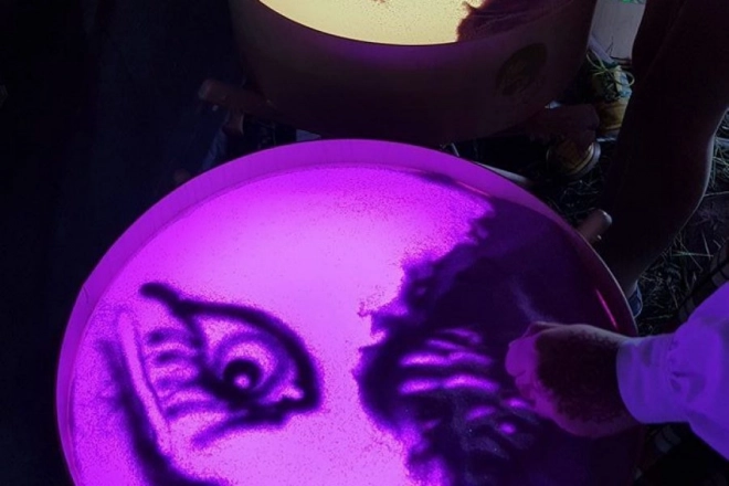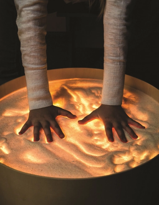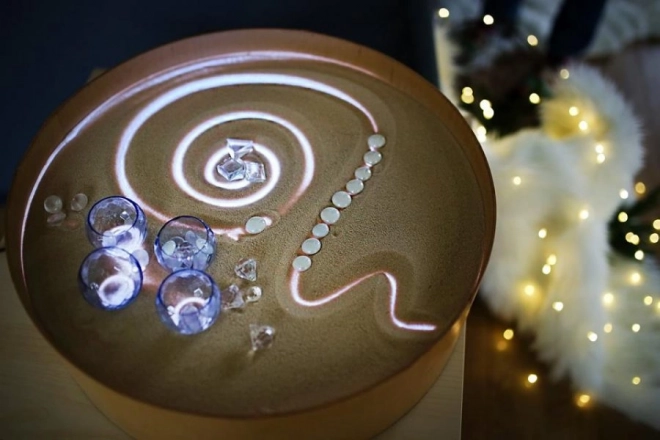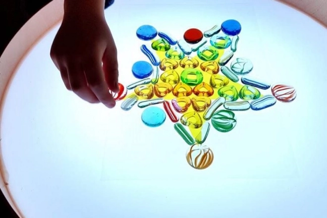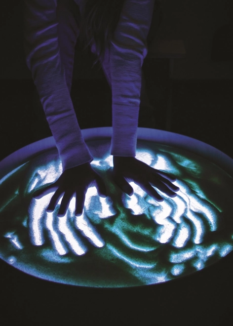 Na desce lze kreslit prsty, štětci i plastovými nástroji, pracovat s pískem, kamínky a dalšími materiály bez obav z nepořádku díky vyvýšené hraně. Stůl poslouží i jako světelná scéna pro malé divadlo, dekorativní osvětlení dětského pokoje či terapeutický nástroj pro rozvoj barevného vnímání, tvarů a vzorů.
