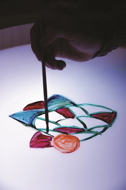 Odolné plexisklo umožňuje různé techniky kresby a tvorby – od prstomalby po práci s pomůckami a tvary.